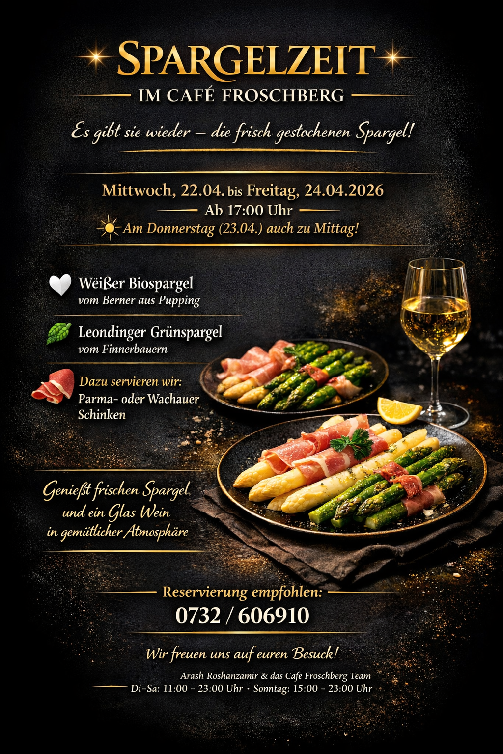 Weißen Biospargel vom Berner aus Pupping und Leondinger Grünspargel vom Finnerbauern. Dazu servieren wir Parma oder Wachauer Schinken.